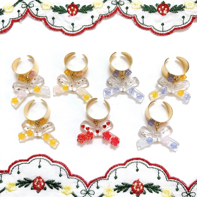 新作のクリアリボンリングの赤リボンバージョン。 真っ赤なアクリルリボンにカラフルなビジューをデコレーションしたキュートなリングです。 土台は真鍮製の14Kメッキでできたフリーリングとなっております。 色々な指輪と重ね付けしても可愛いです。 素材:アクリルビーズ、ガラスビジュー、真鍮 ※送料は追跡ご希望の場合は定形外+追跡あり、追跡不要の方は定形外郵便 をお選びください。 ----------------------------------------------------------------------------------------------- 光を浴び、空気にふれ変化していく花 そんな呼吸する花と歩く楽しみを貴方へ ONIS では本物の花を使ってアイテムを作っております。レジンなどは使わず、レザーやクリアシートで 花を挟みミシンでひとつひとつ丁寧に縫いあげます。 そうする事によって中に空気が残り、 花が呼吸できる状態のままでいられます。 花瓶の花同様、時間がたてば酸化し、色が変化する・・・ その様も楽しんで頂ければと思っております。 また全てのアイテムにはフラワーカードをおつけしております。 カードには、使われている花の名前と花言葉、また花にまつわるお話や、 由来、豆知識など更に花を楽しんで頂けるような内容を書いております。 季節の花を身につけて、日々過ごして頂く。 花言葉に心を込めて大切な人にプレゼントする。 そんな花と共に歩く生活が送れますように。