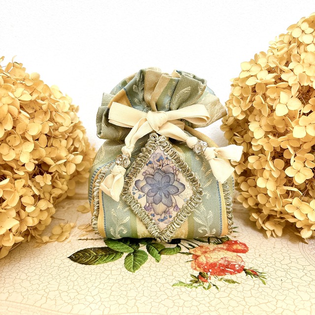 新作、ミニョネットポシェ。 ミニョネット(お人形)の世界から飛び出てきたような、インポートのジャガード生地を使ったアンティーク調の可愛らしいポシェットです。 フロントには本革に押し花を挟み込んだ菱形のモチーフが縫い付けてあり、 他にはないとっておきのポシェットになっております。 お化粧や小物を入れるポーチにしても良いですし、 オプションでショルダーチェーンをつける事も出来ます。 フロントの菱形パーツの部分が水濡れ不可の為、丸洗いの洗濯は出来ません。 必ず汚れた部分のみの部分洗いをして頂くようお願い致します。 フロント部分が汚れた際は乾拭きなどで汚れをふき取って下さい。 こちらの菱形パーツには紫陽花を挟み込んでおります。 【紫陽花の花言葉】 「うつろい」「一家団らん」 紫陽花の花言葉は「うつろい」「移り気」といった花言葉があります。 これは咲始めは白色、段々と水色、青色、紫色、ピンク色へと 姿形を変えていく様からきていると言われています。 色によって花言葉も変わり、白は「寛容」、青は「冷静」、 ピンクは「元気な女性」と様々です。 他にも小さな花(額)が集まっている事から 「家族団らん」という花言葉もあります。 (更に詳しい内容はフラワーカードでお楽しみください) 素材:表生地/ジャガード(ポリエステル100%) 裏地/綿100% 商品サイズ:幅10㎝×奥行10cm×高さ16.5㎝(袋部分11.5㎝) ※こちらの商品はゆうパック60サイズで送らせて頂きます。 送料は地域によって異なります。 ----------------------------------------------------------------------------------------------- 光を浴び、空気にふれ変化していく花 そんな呼吸する花と歩く楽しみを貴方へ ONIS では本物の花を使ってアイテムを作っております。レジンなどは使わず、レザーやクリアシートで 花を挟みミシンでひとつひとつ丁寧に縫いあげます。 そうする事によって中に空気が残り、 花が呼吸できる状態のままでいられます。 花瓶の花同様、時間がたてば酸化し、色が変化する・・・ その様も楽しんで頂ければと思っております。 また全てのアイテムにはフラワーカードをおつけしております。 カードには、使われている花の名前と花言葉、また花にまつわるお話や、 由来、豆知識など更に花を楽しんで頂けるような内容を書いております。 季節の花を身につけて、日々過ごして頂く。 花言葉に心を込めて大切な人にプレゼントする。 そんな花と共に歩く生活が送れますように。