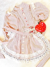 アイボリー地に紅い小蝶が捺染された可愛らしい生地で、それにヴィンテージのレースやボタンを使って、レトロな雰囲気に仕上げております。