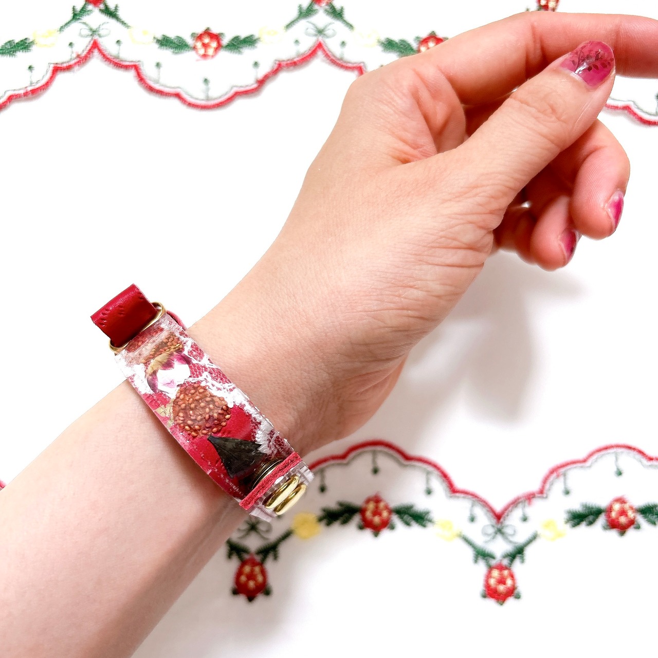赤い本革の上に白いスカラップレース、苺をのせたショートケーキのようなデザイン。
