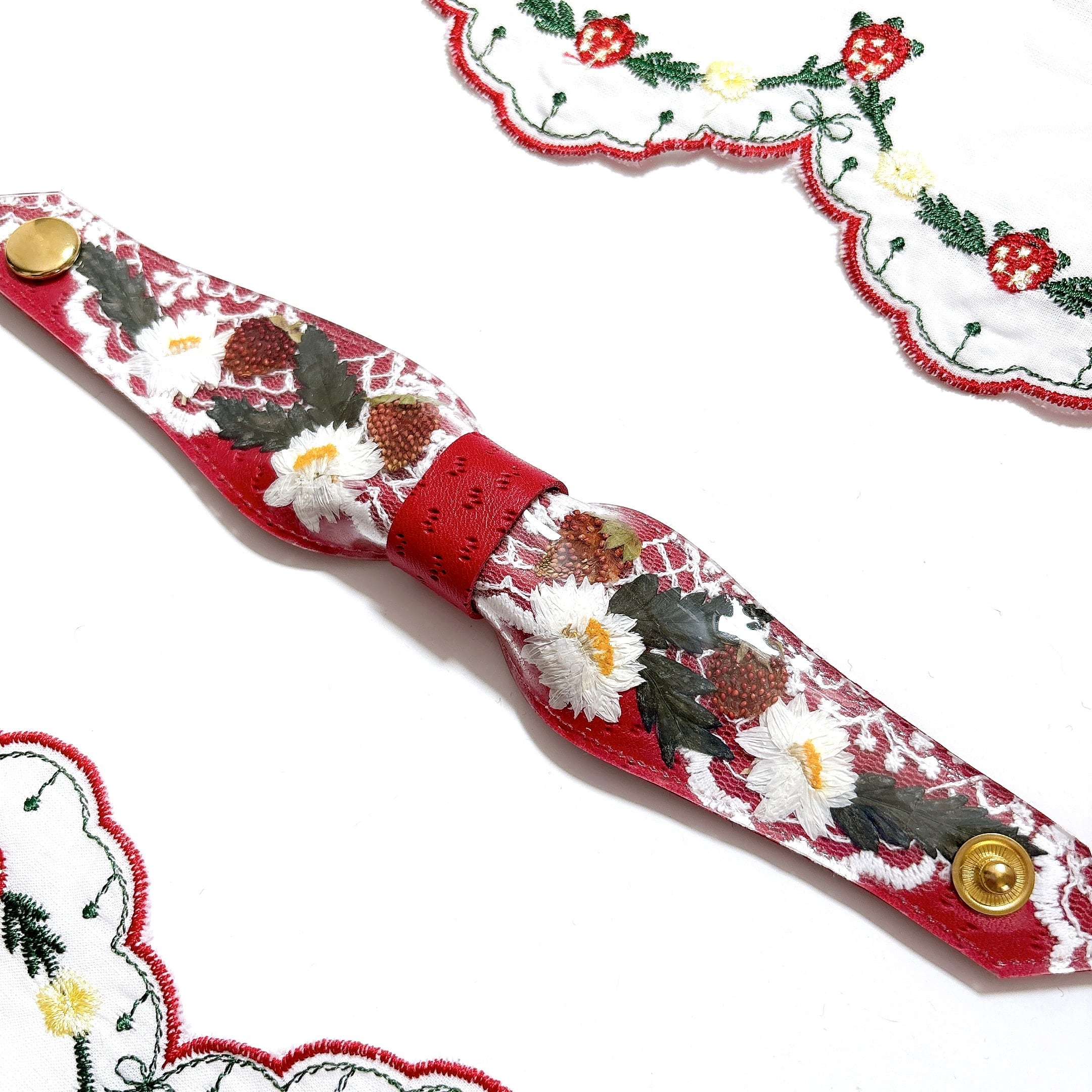 赤い本革の上に白いスカラップレース、苺をのせたショートケーキのようなデザイン。