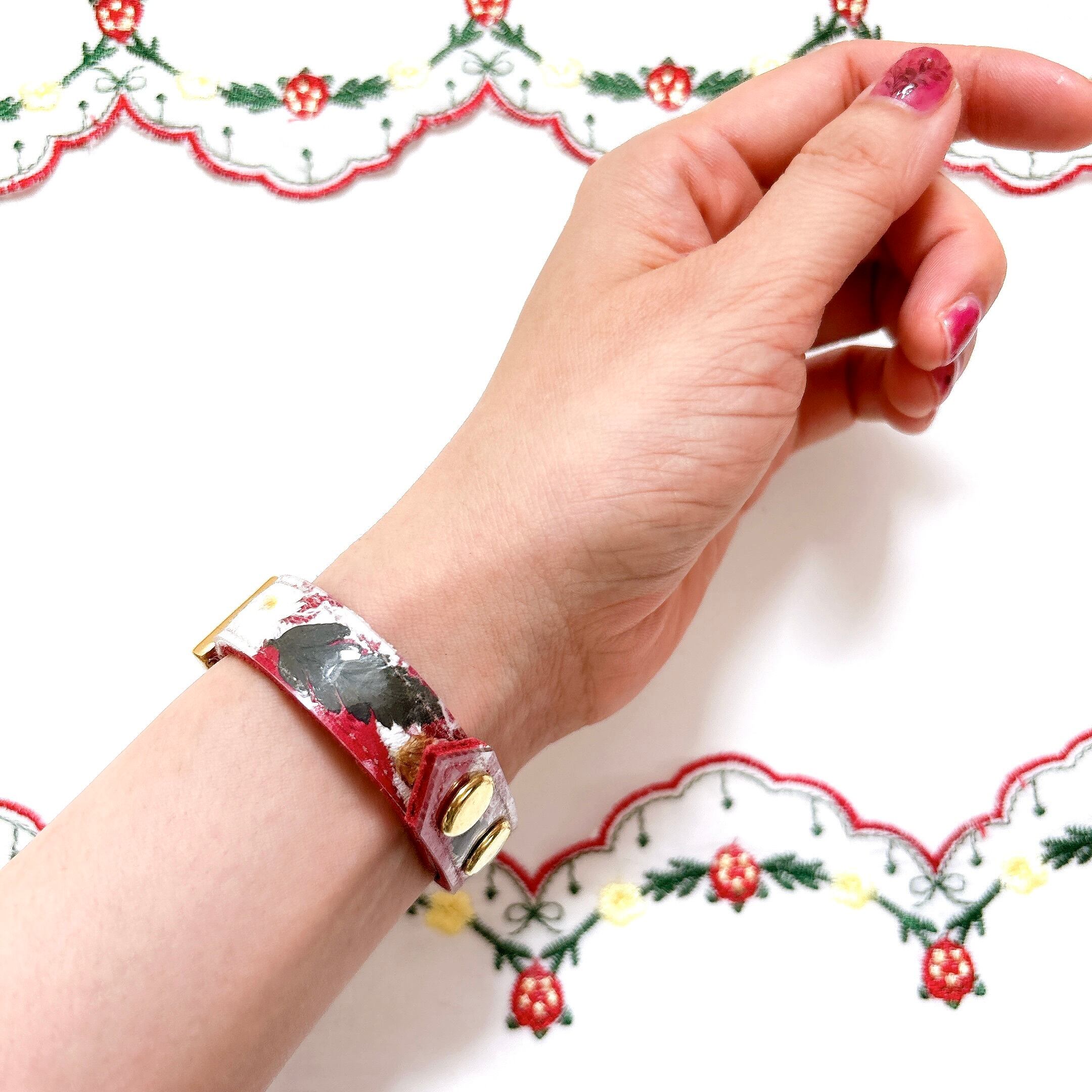 赤い本革の上に白いスカラップレース、苺をのせたショートケーキのようなデザイン。