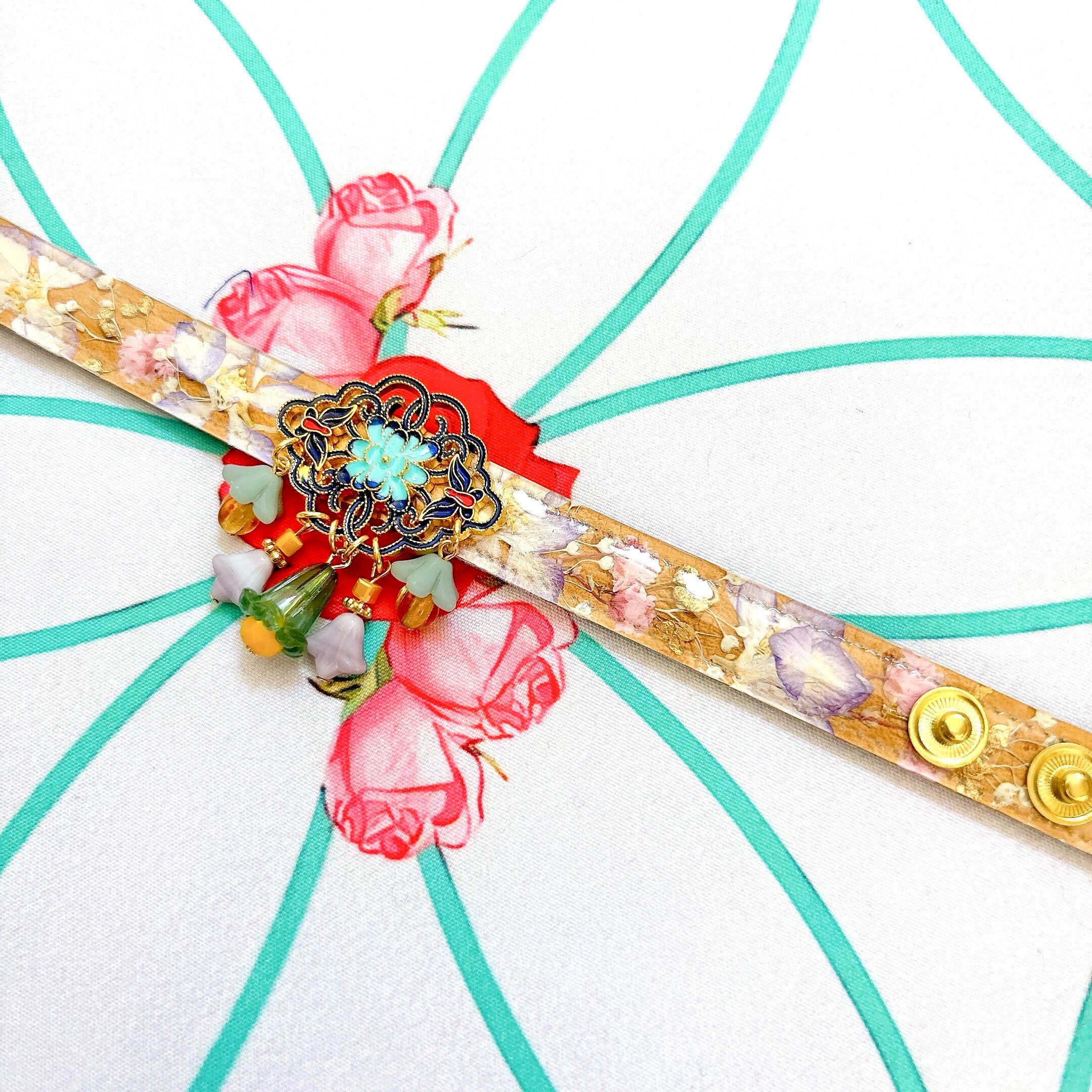 中心にオリエンタルなビジュー金具が光る、夏にぴったりのブレスです。