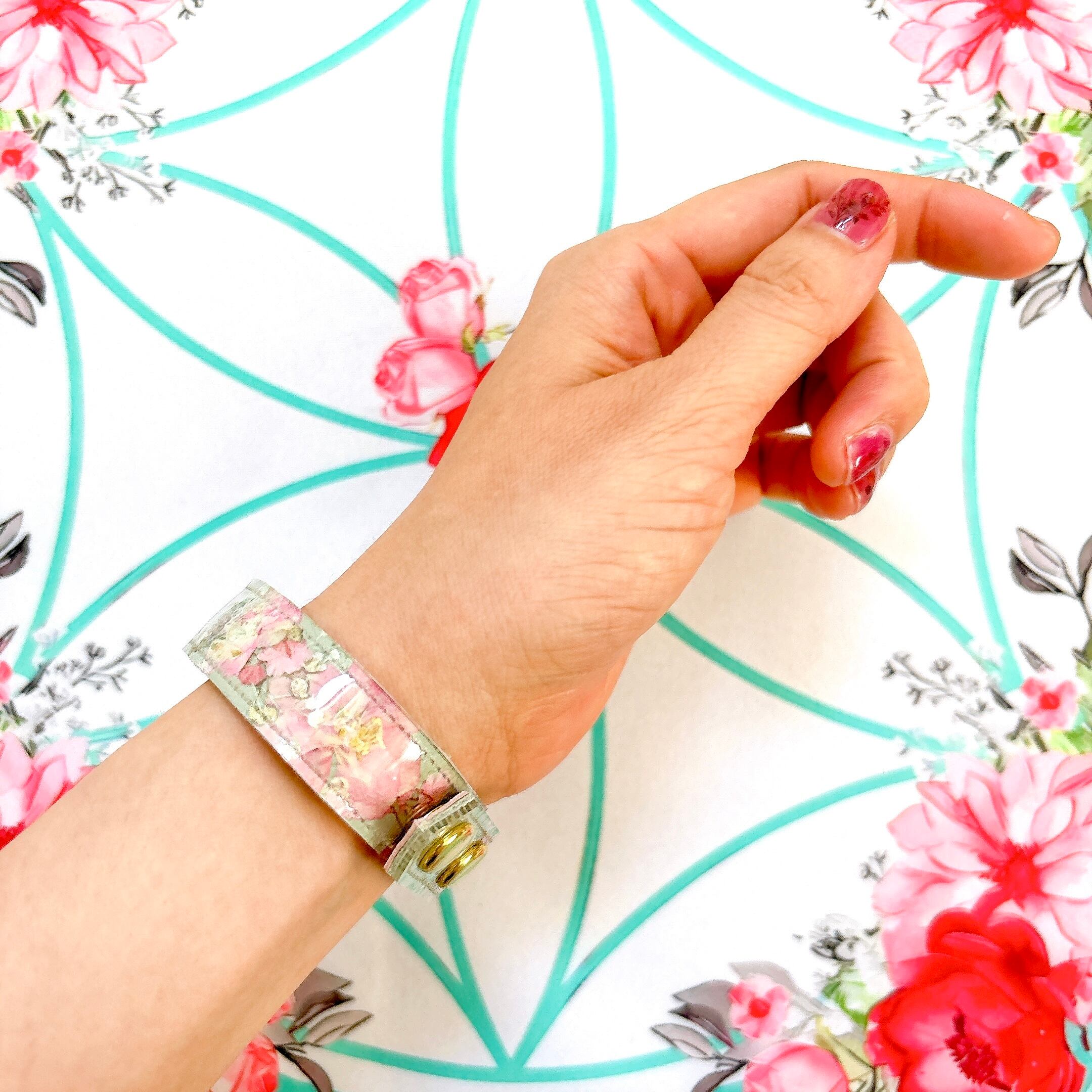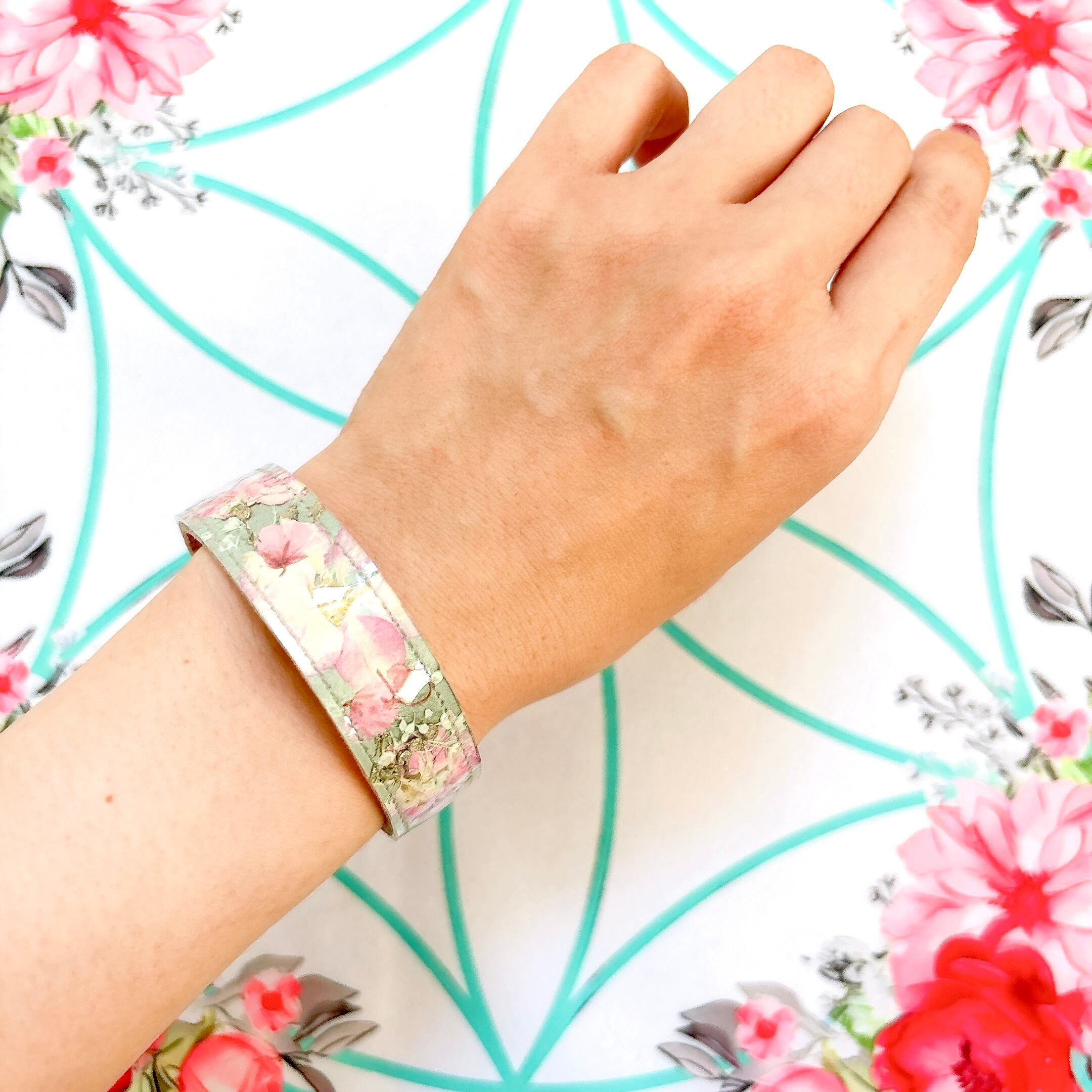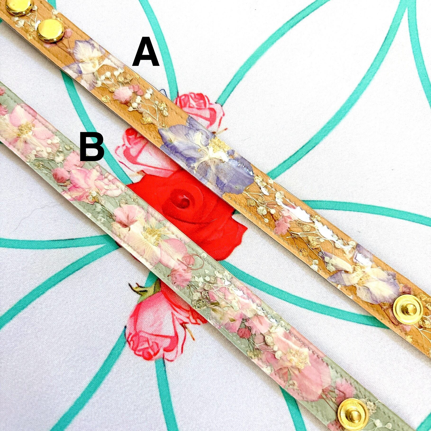 マスタードイエローの本革にライラック色の千鳥草をのせたシンプルブレスです。