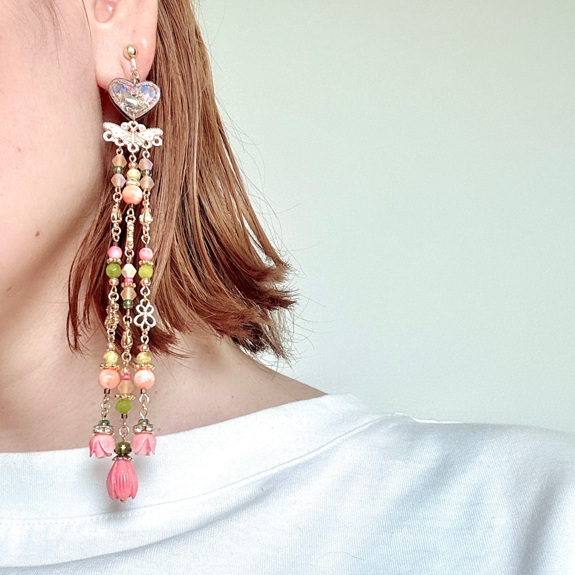 極小のビーズやメタルコネクタが耳元でしゃらしゃらと揺れ、特別感のある長さが