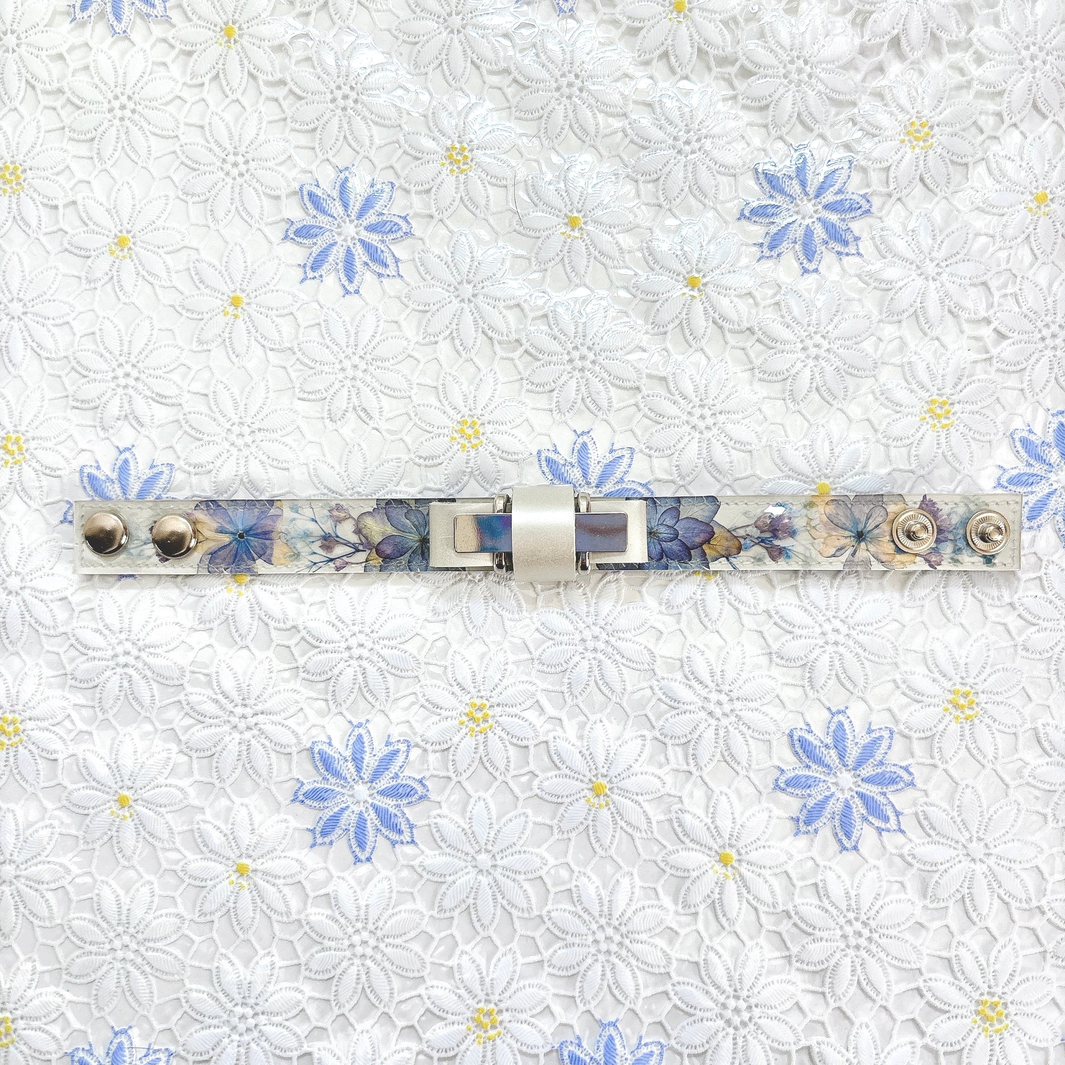 ホワイトパールの本革に鉱石のような紫陽花をのせて縫いあげたブレスです。