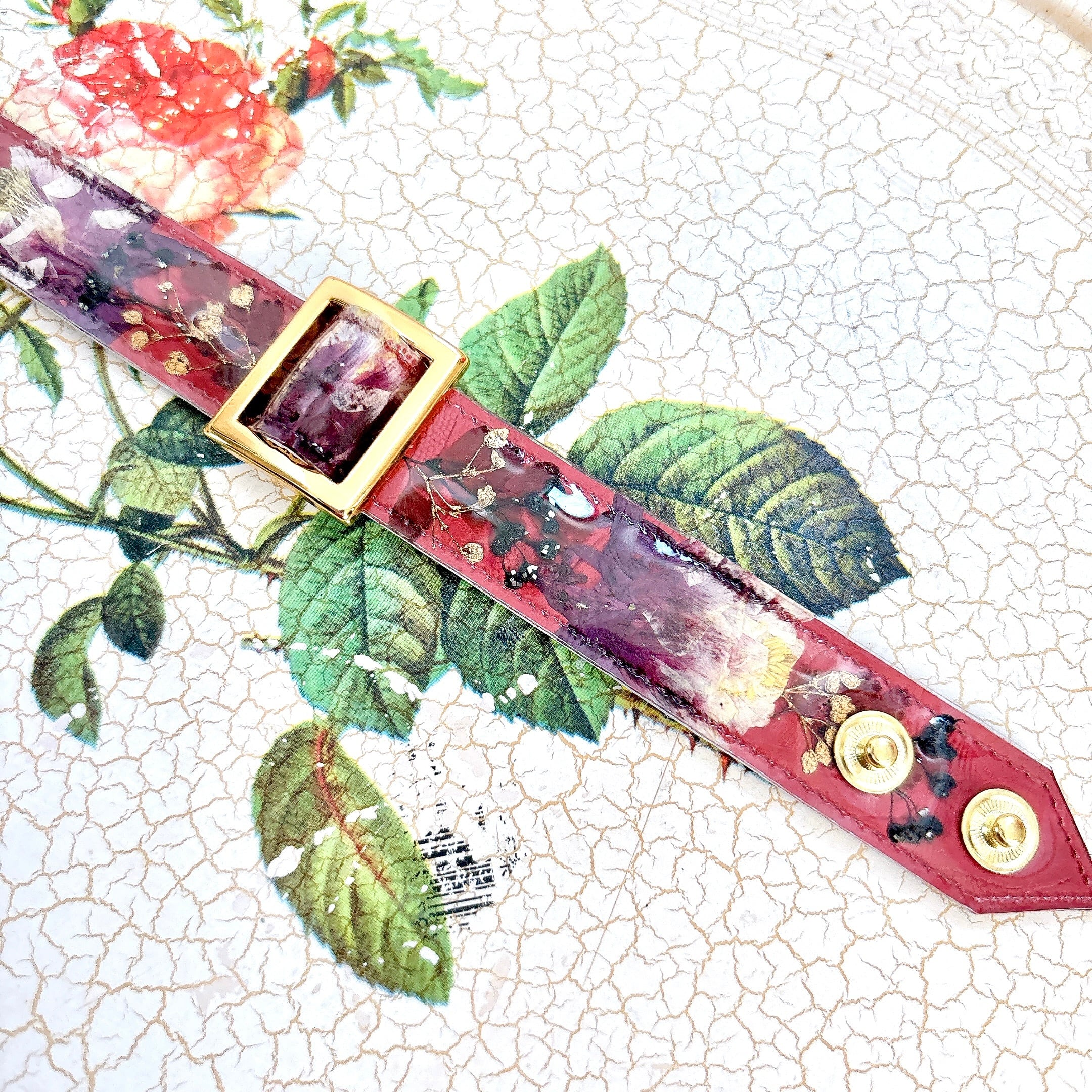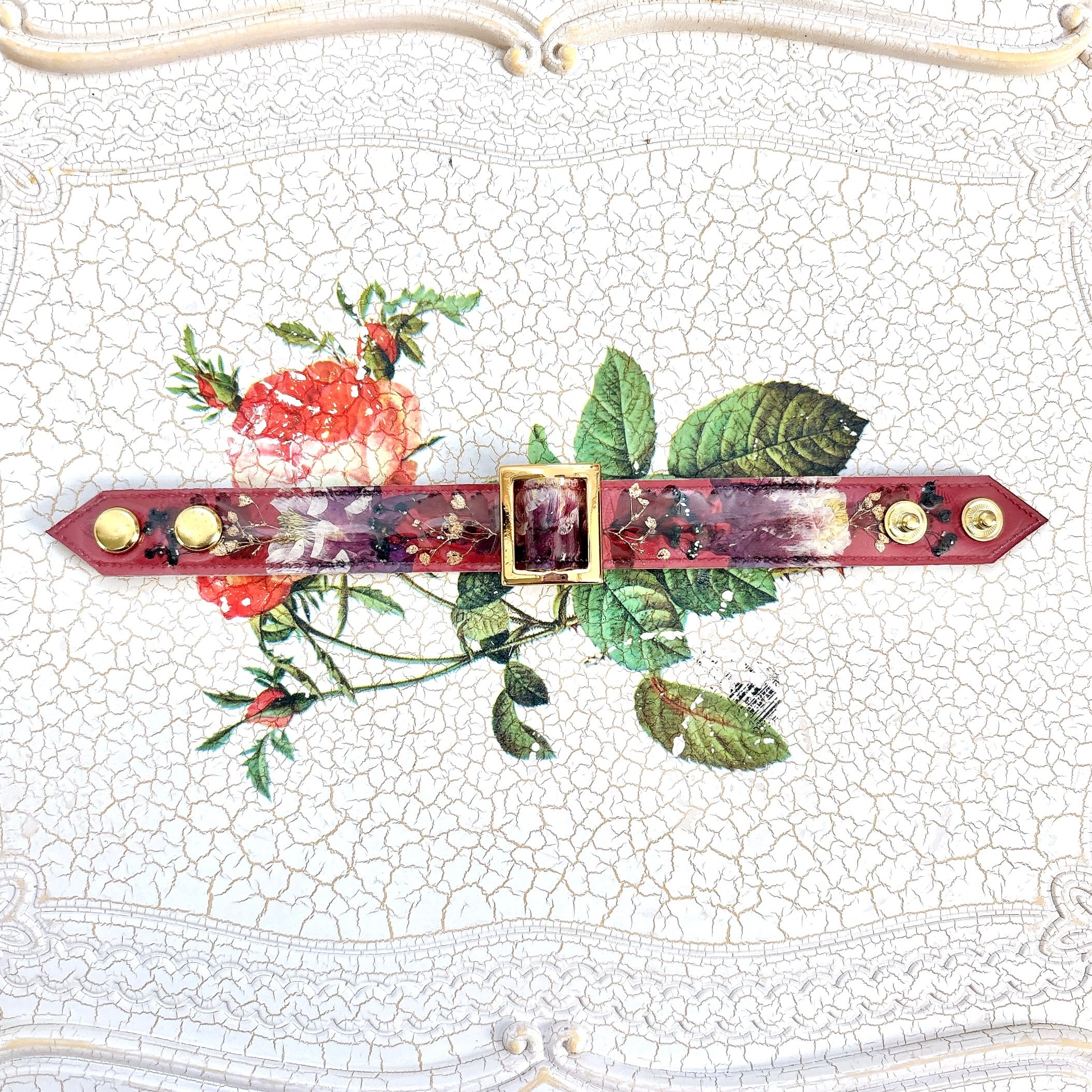 エンジの本革に赤紫の苧環をのせ縫いあげたブレスです。