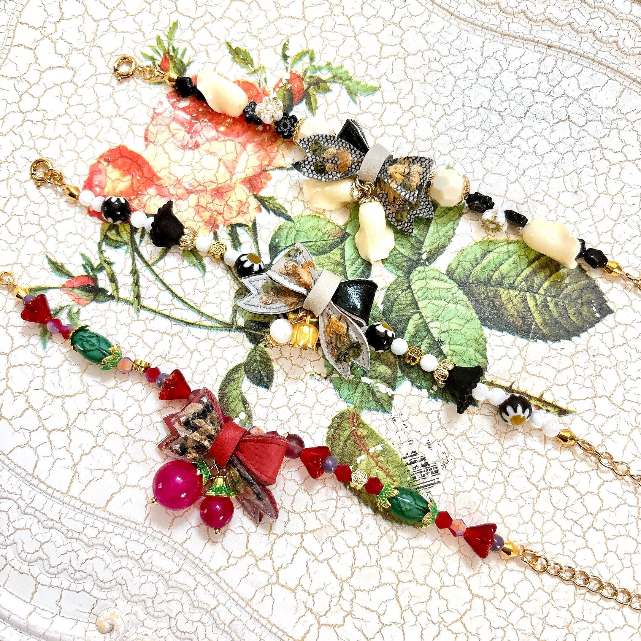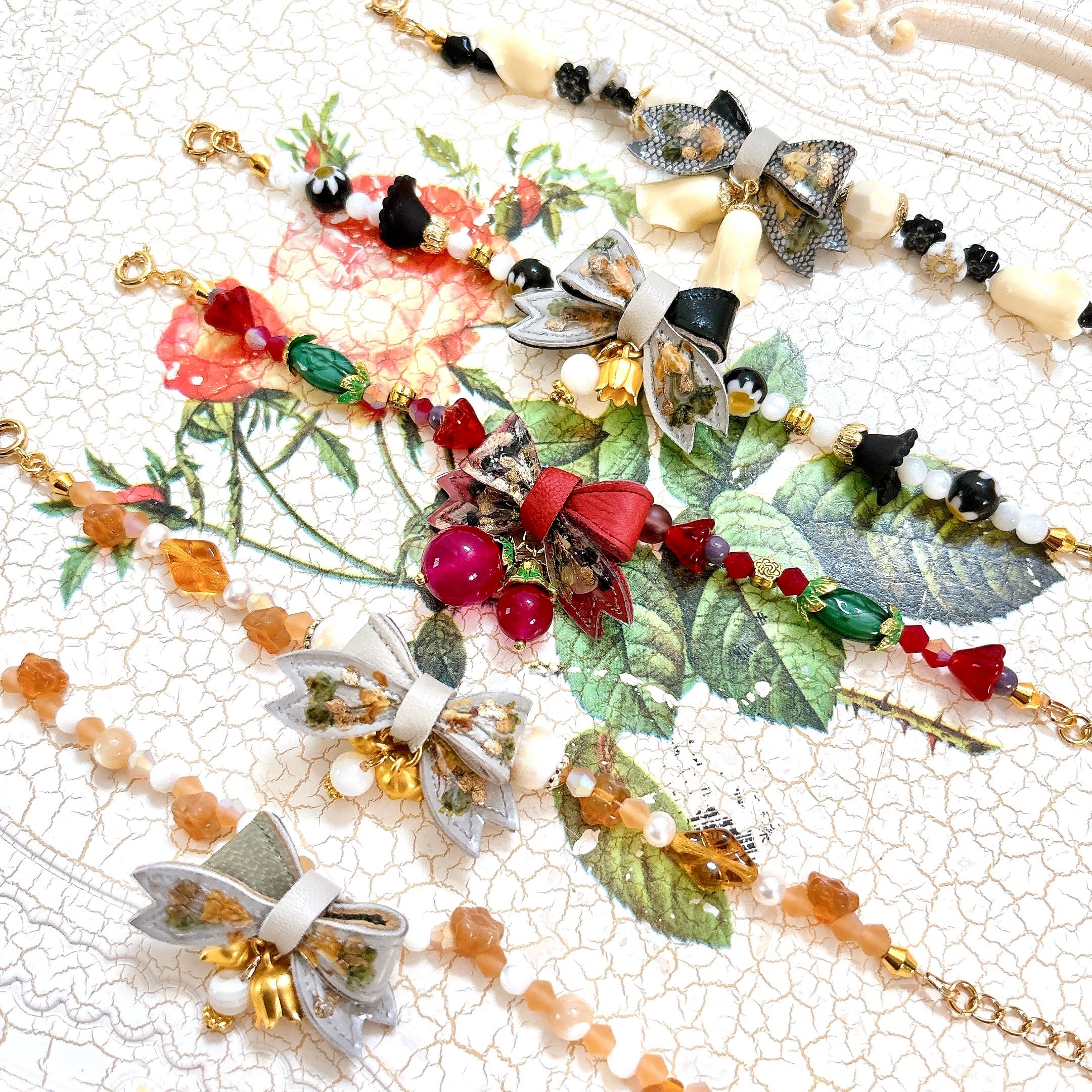 本革にお花を挟んだチビリボンに、天然石やガラスビーズで繋いだミサンガブレスレット。