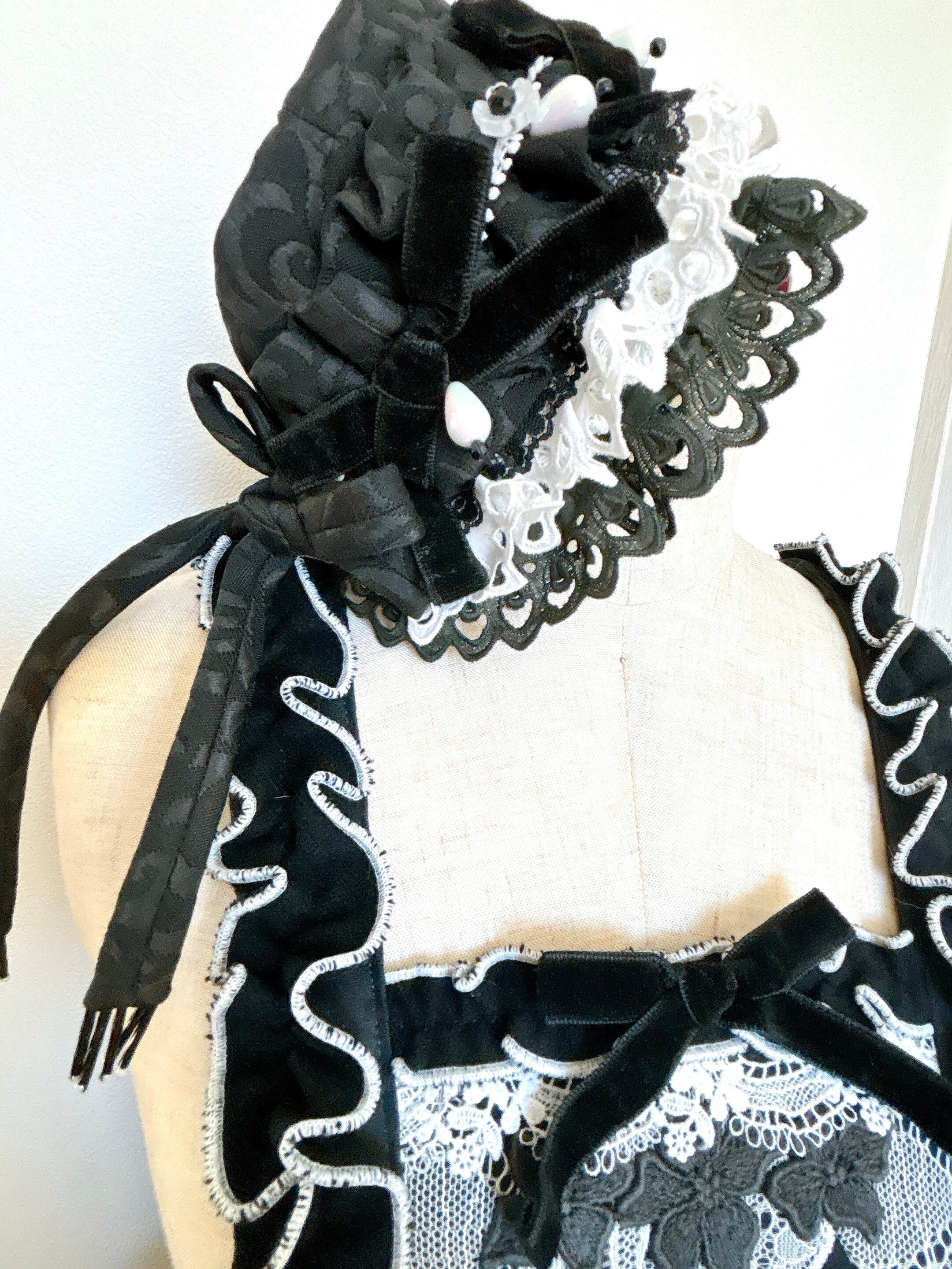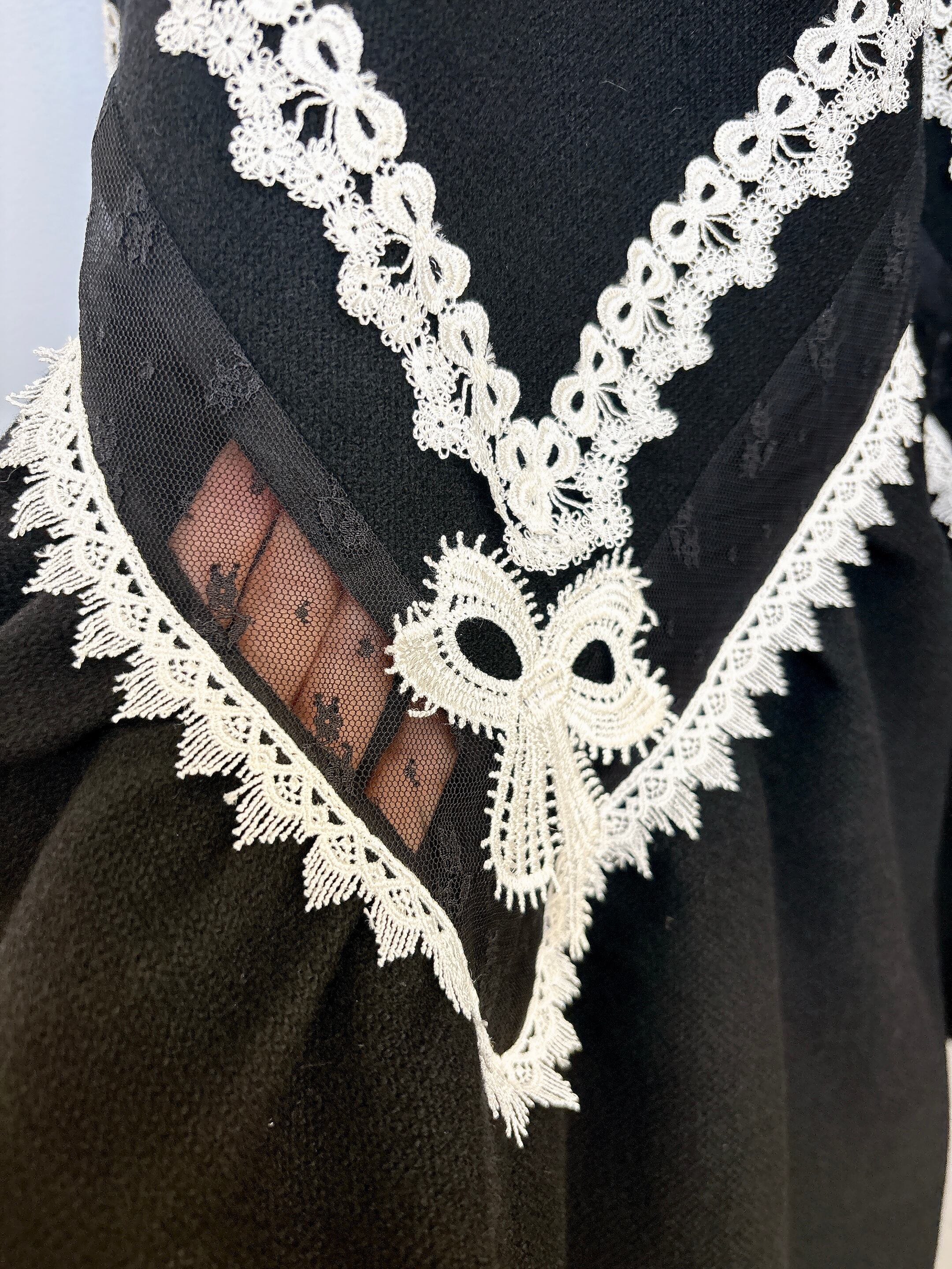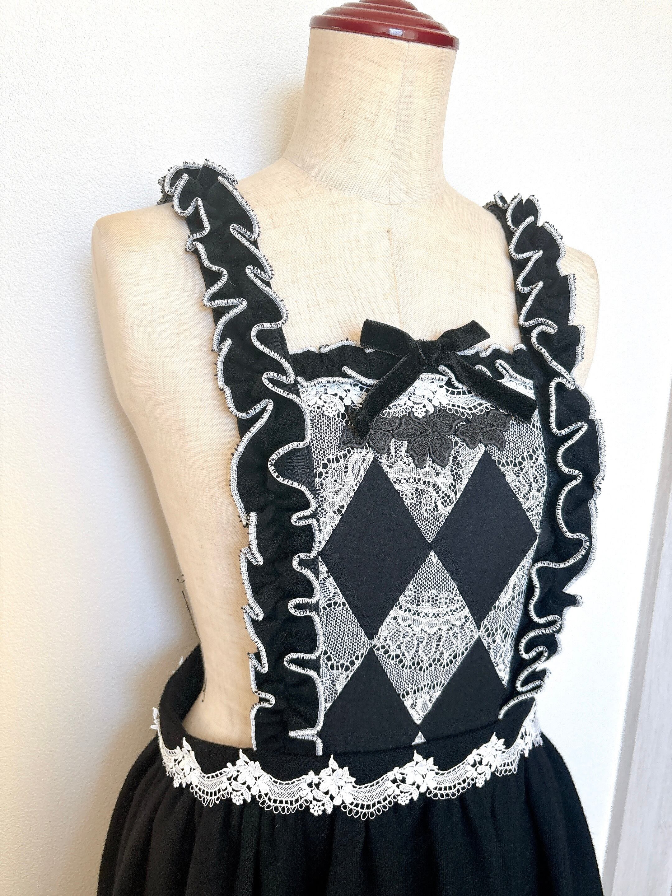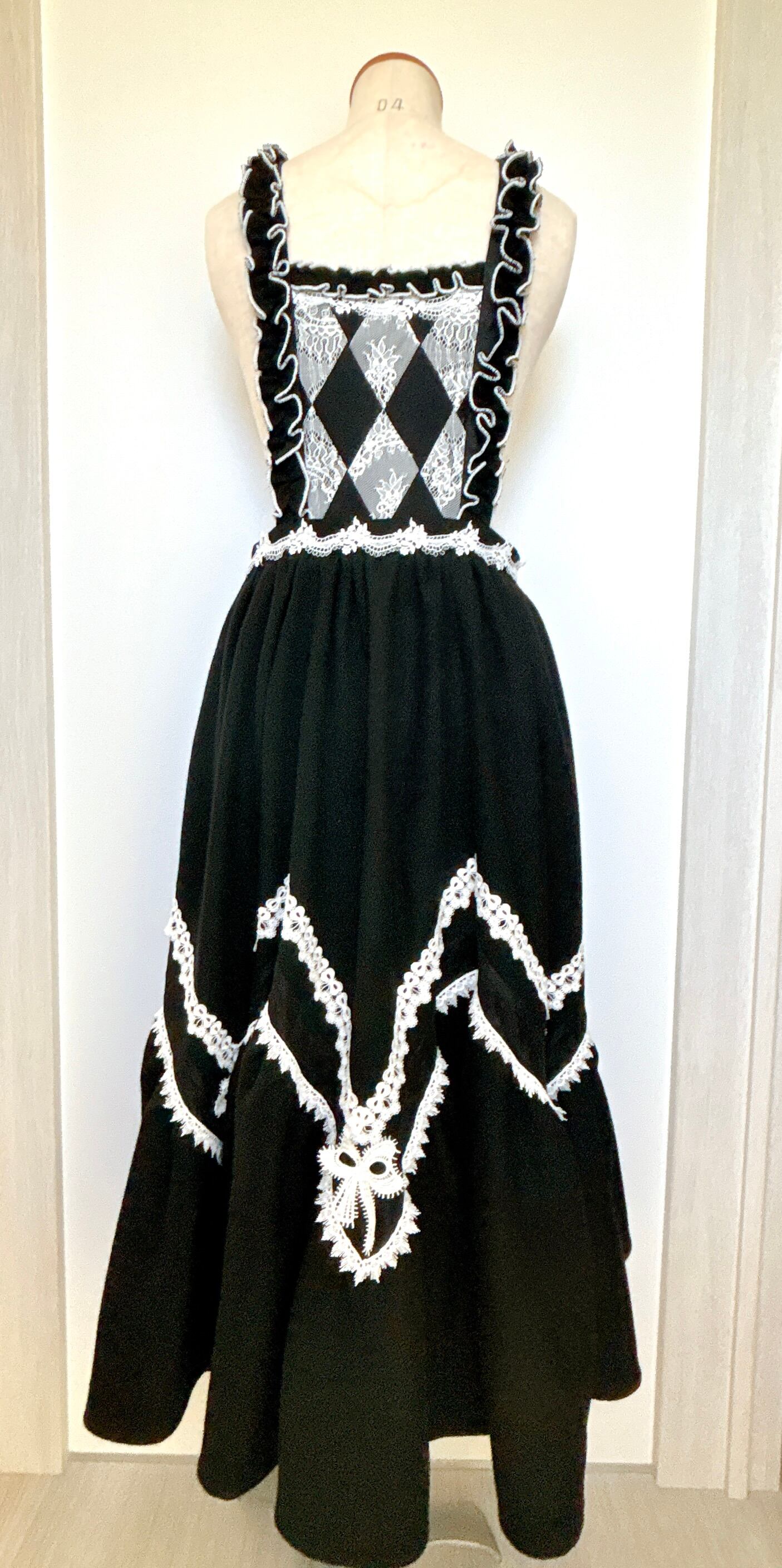 国産ウールをたっぷり使い、バイカラーで統一された大人のエプロンドレス。胸元のパッチワークや、裾のレースの切り替えなど細部にこだわったとっておきの1着です。